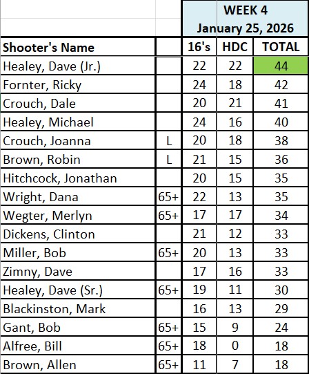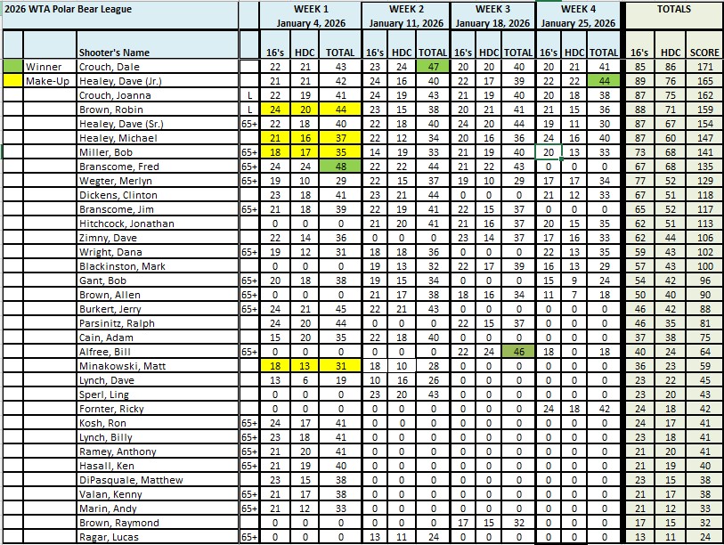Please hit the "refresh" or "reload" button in your Web Browser to get the current information. The most recent update was February 10, 2026. Sign-up for the Polar Bear League starts at 10:00 am and stops at Noon. The results for Week 4 can be seen here. Results for Week 1 - 4 can be seen here. Any future cancellations will be posted by noon the day before. WTA is now on Facebook. Log into Facebook and search for "wilmington trapshooting association". Help Needed WTA needs scorers (kids 14 or older, adults, retirees, etc.). Please contact Allan Brown (302-740-9525) if you are interested or know someone that might be. Easy work and good pay! Volunteers to score are always welcome to help keep costs down. |